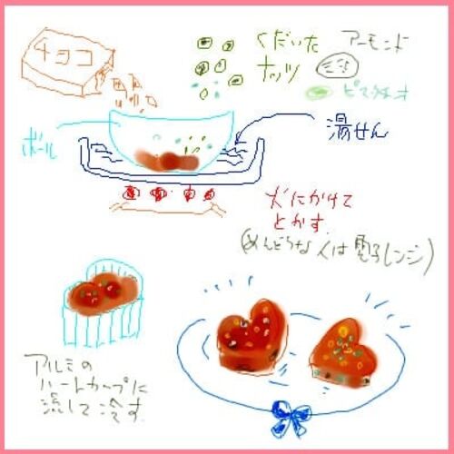 バレンタインデーに向けて手作りチョコはいかが!! 定番の 「超簡単チョコレシピ」です! オリジナルチョコで ハートを GET! 超簡単 チョコ レシピ 1) ブロックのチョコを細かくして、ボールに入れる。 2) ボールをお湯につけてチョコを溶かす(湯…